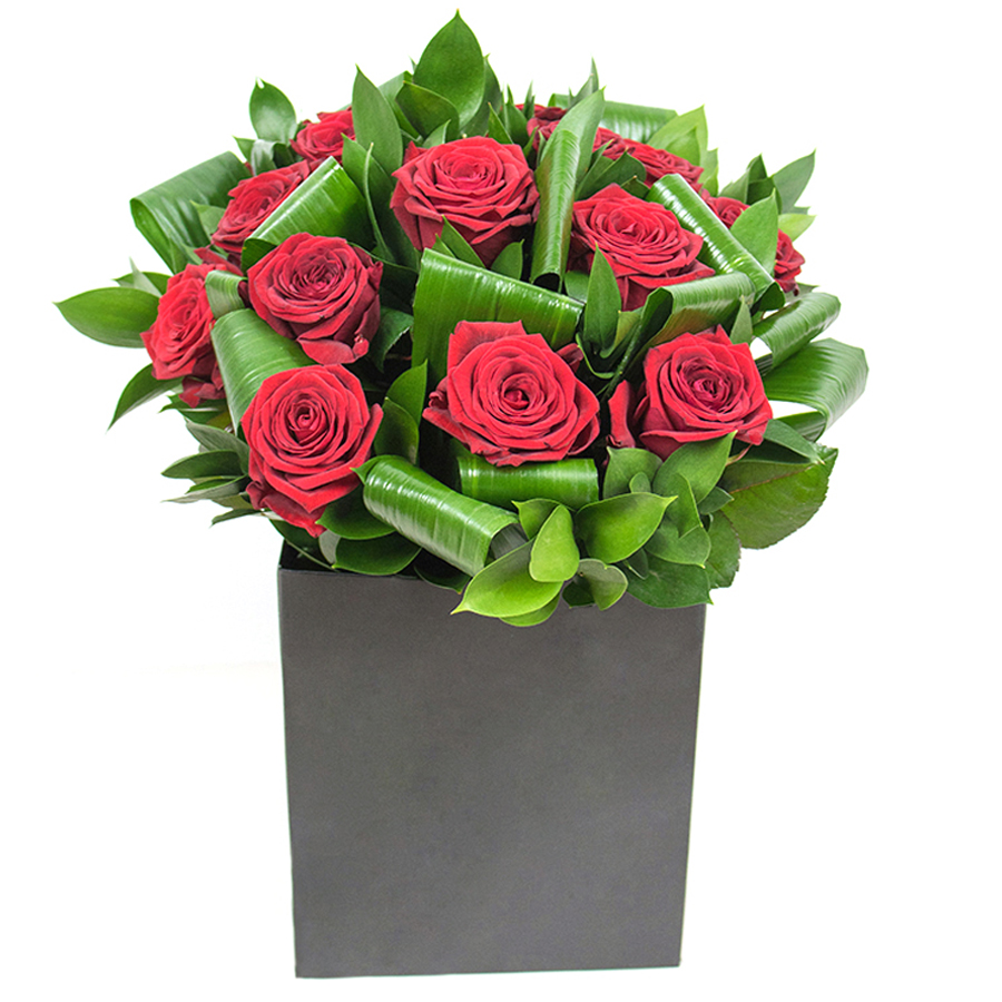 Illuminate your home with our radiant red rose bouquet, featuring vibrant red roses, lush aspidistra leaves, and elegant ruscus. This exquisite arrangement is crafted to deliver beauty and sophistication.